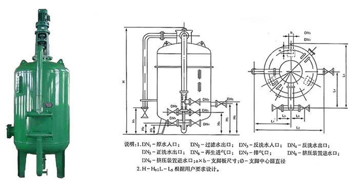 結構簡單:主要由以下部分構成:配套管線和閥門,其中過濾器體又包括:筒體、反洗氣管、布水組件、支撐組件、濾料、排氣閥(外置)等